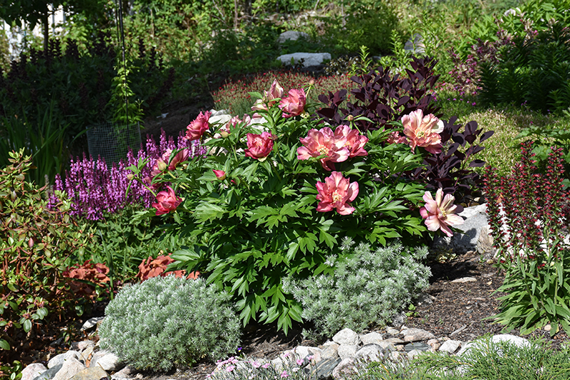 Hardiness Zone: 3a Other Names: Itoh Peony Group/Class: Itoh Hybrids Description: Large double blooms that are soft peach blending to reddish purple at the tips, above lush foliage; sturdy flower stems do not need to be staked; an especially vigorous plant Ornamental Features Julia Rose Peony features bold lightly-scented double peach flowers with creamy white overtones, gold eyes and plum purple tips at the ends of the stems in late spring. The flowers are excellent for cutting. Its compound leaves remain green in color throughout the season. Landscape Attributes Julia Rose Peony is an herbaceous perennial with a mounded form. Its medium texture blends into the garden, but can always be balanced by a couple of finer or coarser plants for an effective composition. This is a relatively low maintenance plant, and should be cut back in late fall in preparation for winter. It is a good choice for attracting bees and butterflies to your yard, but is not particularly attractive to deer who tend to leave it alone in favor of tastier treats. Gardeners should be aware of the following characteristic(s) that may warrant special consideration; Julia Rose Peony is recommended for the following landscape applications; Planting & Growing Julia Rose Peony will grow to be about 30 inches tall at maturity, with a spread of 4 feet. When grown in masses or used as a bedding plant, individual plants should be spaced approximately 3 feet apart. It grows at a slow rate, and under ideal conditions can be expected to live for approximately 20 years. As an herbaceous perennial, this plant will usually die back to the crown each winter, and will regrow from the base each spring. Be careful not to disturb the crown in late winter when it may not be readily seen! This plant does best in full sun to partial shade. It does best in average to evenly moist conditions, but will not tolerate standing water. It is not particular as to soil pH, but grows best in rich soils. It is somewhat tolerant of urban pollution. This particular variety is an interspecific hybrid. It can be propagated by division; however, as a cultivated variety, be aware that it may be subject to certain restrictions or prohibitions on propagation.