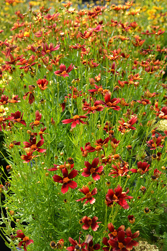 Hardiness Zone: 4a Group/Class: Permathread Series Description: An upright variety covered with glowing scarlet-red blooms with orange central disks, floating over fine, whispy green foliage; tolerant of pests and drier soils; thriving in sandy and rocky areas; coreopsis needs good drainage Ornamental Features Red Satin Tickseed is smothered in stunning scarlet daisy flowers with orange eyes at the ends of the stems from early summer to early fall. The flowers are excellent for cutting. Its threadlike leaves remain emerald green in color throughout the season. Landscape Attributes Red Satin Tickseed is an open herbaceous perennial with a mounded form. It brings an extremely fine and delicate texture to the garden composition and should be used to full effect. This is a relatively low maintenance plant, and is best cleaned up in early spring before it resumes active growth for the season. It is a good choice for attracting butterflies to your yard, but is not particularly attractive to deer who tend to leave it alone in favor of tastier treats. It has no significant negative characteristics. Red Satin Tickseed is recommended for the following landscape applications; Planting & Growing Red Satin Tickseed will grow to be about 15 inches tall at maturity, with a spread of 20 inches. Its foliage tends to remain dense right to the ground, not requiring facer plants in front. It grows at a medium rate, and under ideal conditions can be expected to live for approximately 10 years. As an herbaceous perennial, this plant will usually die back to the crown each winter, and will regrow from the base each spring. Be careful not to disturb the crown in late winter when it may not be readily seen! This plant should only be grown in full sunlight. It does best in average to evenly moist conditions, but will not tolerate standing water. It is not particular as to soil pH, but grows best in poor soils. It is somewhat tolerant of urban pollution. This particular variety is an interspecific hybrid. It can be propagated by division; however, as a cultivated variety, be aware that it may be subject to certain restrictions or prohibitions on propagation. Red Satin Tickseed is a fine choice for the garden, but it is also a good selection for planting in outdoor pots and containers. It is often used as a 'filler' in the 'spiller-thriller-filler' container combination, providing a mass of flowers against which the thriller plants stand out. Note that when growing plants in outdoor containers and baskets, they may require more frequent waterings than they would in the yard or garden.
