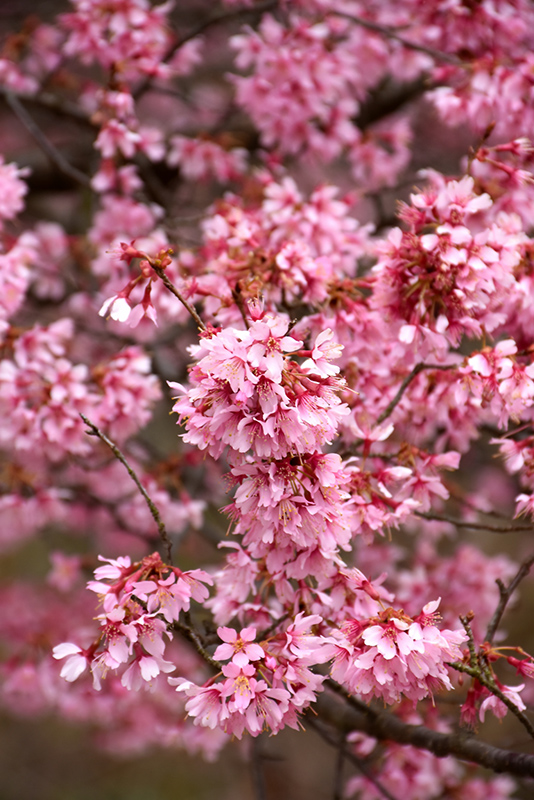 Hardiness Zone: 6a Other Names: Ornamental Cherry Description: A beautiful spring flowering accent tree, featuring rich, bright pink flowers before the leaves, attractive reddish-brown bark and an arching, vase shaped habit of growth; needs full sun and well-drained soil; has a high tolerance to insects and disease Ornamental Features Okame Flowering Cherry is smothered in stunning clusters of lightly-scented pink flowers along the branches in early spring, which emerge from distinctive rose flower buds before the leaves. It has forest green deciduous foliage. The pointy leaves turn outstanding shades of orange and red in the fall. The fruits are showy black drupes displayed in mid summer. The smooth dark red bark adds an interesting dimension to the landscape. Landscape Attributes Okame Flowering Cherry is a deciduous tree with an indistinguished habit of growth. Its average texture blends into the landscape, but can be balanced by one or two finer or coarser trees or shrubs for an effective composition. This is a relatively low maintenance tree, and is best pruned in late winter once the threat of extreme cold has passed. It is a good choice for attracting birds to your yard. It has no significant negative characteristics. Okame Flowering Cherry is recommended for the following landscape applications; Planting & Growing Okame Flowering Cherry will grow to be about 20 feet tall at maturity, with a spread of 15 feet. It has a low canopy with a typical clearance of 4 feet from the ground, and is suitable for planting under power lines. It grows at a medium rate, and under ideal conditions can be expected to live for 50 years or more. This tree should only be grown in full sunlight. It does best in average to evenly moist conditions, but will not tolerate standing water. It is not particular as to soil pH, but grows best in rich soils. It is highly tolerant of urban pollution and will even thrive in inner city environments. This particular variety is an interspecific hybrid.