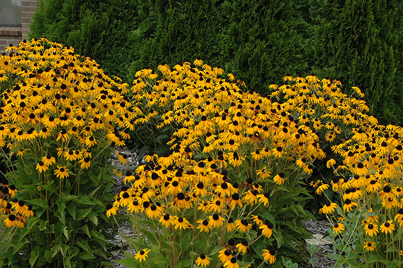 Hardiness Zone: 3a Other Names: Orange Coneflower, Black Eyed Susan Ornamental Features Goldsturm Coneflower has masses of beautiful gold daisy flowers with dark brown eyes at the ends of the stems from mid summer to early fall, which are most effective when planted in groupings. The flowers are excellent for cutting. Its serrated pointy leaves remain dark green in color throughout the season. Landscape Attributes Goldsturm Coneflower is an herbaceous perennial with an upright spreading habit of growth. Its medium texture blends into the garden, but can always be balanced by a couple of finer or coarser plants for an effective composition. This is a relatively low maintenance plant, and should be cut back in late fall in preparation for winter. It is a good choice for attracting butterflies to your yard, but is not particularly attractive to deer who tend to leave it alone in favor of tastier treats. It has no significant negative characteristics. Goldsturm Coneflower is recommended for the following landscape applications; Planting & Growing Goldsturm Coneflower will grow to be about 24 inches tall at maturity, with a spread of 24 inches. When grown in masses or used as a bedding plant, individual plants should be spaced approximately 18 inches apart. It grows at a fast rate, and under ideal conditions can be expected to live for approximately 15 years. As an herbaceous perennial, this plant will usually die back to the crown each winter, and will regrow from the base each spring. Be careful not to disturb the crown in late winter when it may not be readily seen! This plant should only be grown in full sunlight. It prefers to grow in average to moist conditions, and shouldn't be allowed to dry out. It is not particular as to soil type or pH. It is highly tolerant of urban pollution and will even thrive in inner city environments. This is a selection of a native North American species. It can be propagated by division; however, as a cultivated variety, be aware that it may be subject to certain restrictions or prohibitions on propagation. Goldsturm Coneflower is a fine choice for the garden, but it is also a good selection for planting in outdoor pots and containers. With its upright habit of growth, it is best suited for use as a 'thriller' in the 'spiller-thriller-filler' container combination; plant it near the center of the pot, surrounded by smaller plants and those that spill over the edges. It is even sizeable enough that it can be grown alone in a suitable container. Note that when growing plants in outdoor containers and baskets, they may require more frequent waterings than they would in the yard or garden.![]()