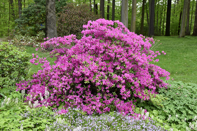 Hardiness Zone: 4b Description: An extraordinary and stunning variety presenting multiple clusters of bright lavender-pink blooms on a hardy and dense compact shrub; a beautiful presentation as a garden focal point Ornamental Features Karen Azalea is bathed in stunning clusters of lightly-scented lilac purple trumpet-shaped flowers with pink overtones at the ends of the branches in mid spring before the leaves. It has dark green deciduous foliage. The narrow leaves do not develop any appreciable fall color. Landscape Attributes Karen Azalea is an open multi-stemmed deciduous shrub with a more or less rounded form. Its relatively coarse texture can be used to stand it apart from other landscape plants with finer foliage. This is a relatively low maintenance shrub, and should only be pruned after flowering to avoid removing any of the current season's flowers. It has no significant negative characteristics. Karen Azalea is recommended for the following landscape applications; Planting & Growing Karen Azalea will grow to be about 4 feet tall at maturity, with a spread of 4 feet. It tends to be a little leggy, with a typical clearance of 1 foot from the ground. It grows at a slow rate, and under ideal conditions can be expected to live for 40 years or more. This shrub does best in full sun to partial shade. You may want to keep it away from hot, dry locations that receive direct afternoon sun or which get reflected sunlight, such as against the south side of a white wall. It requires an evenly moist well-drained soil for optimal growth, but will die in standing water. It is very fussy about its soil conditions and must have rich, acidic soils to ensure success, and is subject to chlorosis (yellowing) of the foliage in alkaline soils. It is somewhat tolerant of urban pollution, and will benefit from being planted in a relatively sheltered location. Consider applying a thick mulch around the root zone in winter to protect it in exposed locations or colder microclimates. This particular variety is an interspecific hybrid.